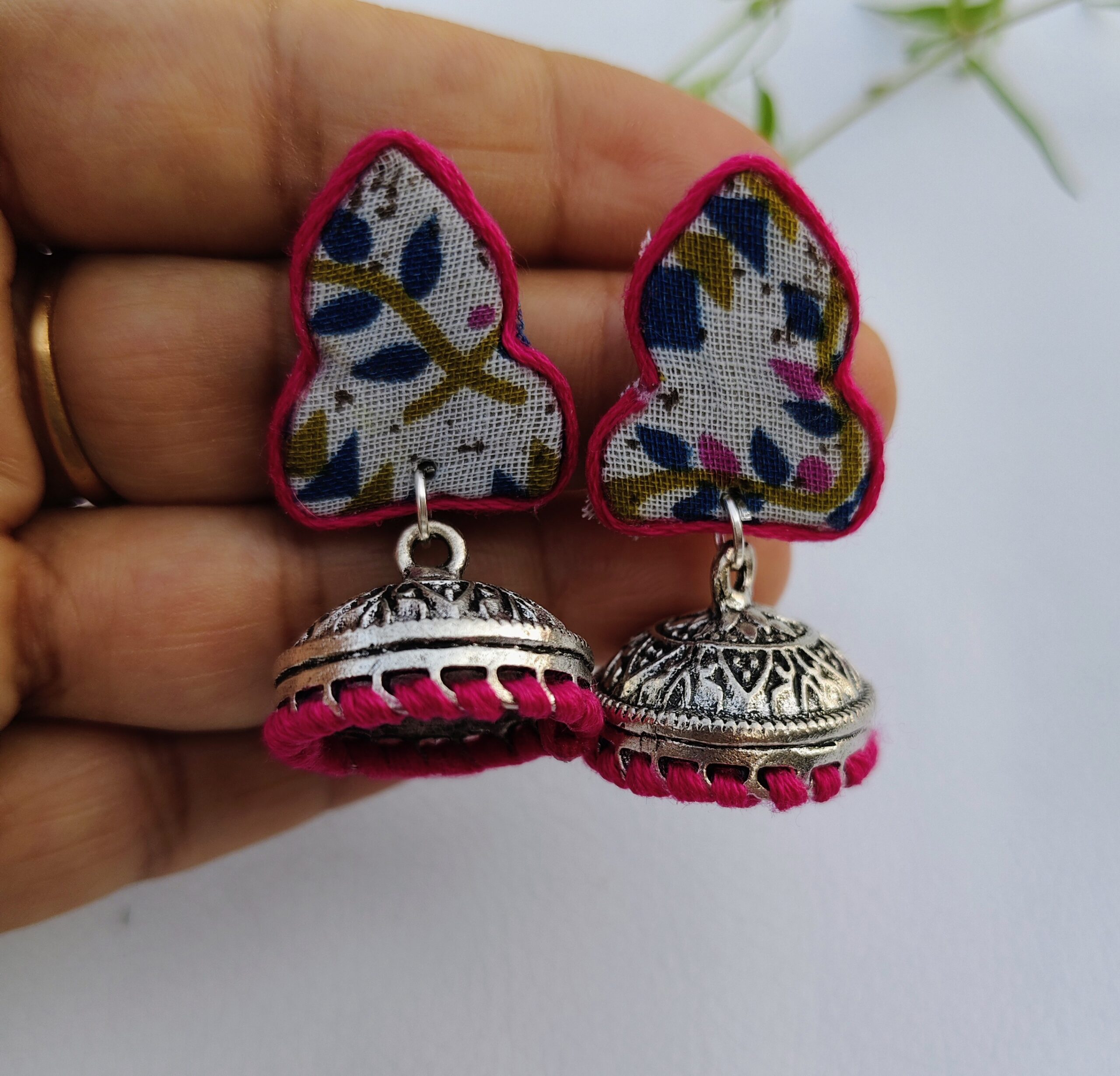 Add a touch of elegance to your look with these handcrafted fabric jhumkas. The earrings feature a soft floral fabric base outlined with bright pink thread and adorned with intricately designed silver dome jhumkas. Lightweight and eye-catching, these earrings beautifully blend traditional charm with modern style — perfect for festive outfits, ethnic wear, or even a casual day out.