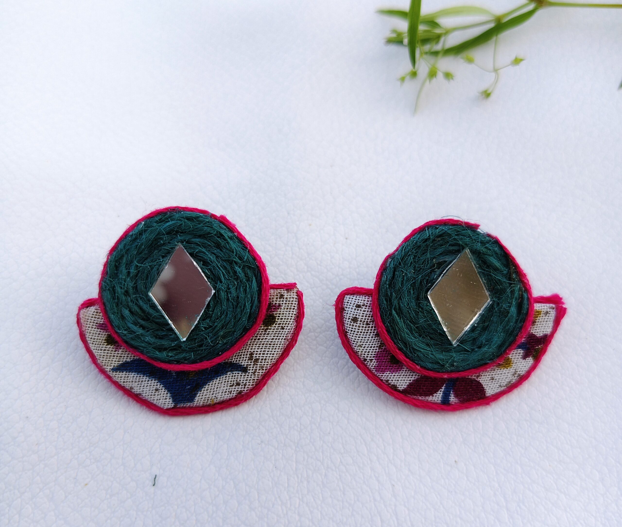 These handcrafted fabric earrings are a perfect blend of tradition and trend. Designed with a rich green circular fabric center adorned with diamond-shaped mirror work, they feature a soft floral fabric base highlighted with bright pink thread edging. Lightweight, colorful, and unique — these earrings add a stylish ethnic charm to any outfit.